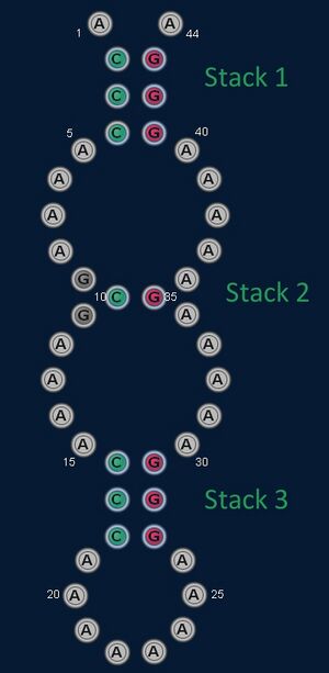 A stack of length 1 is an isolated base pair. It is flanked on either side by a loop. In the image to the right, stack 2 is an isolated base pair.